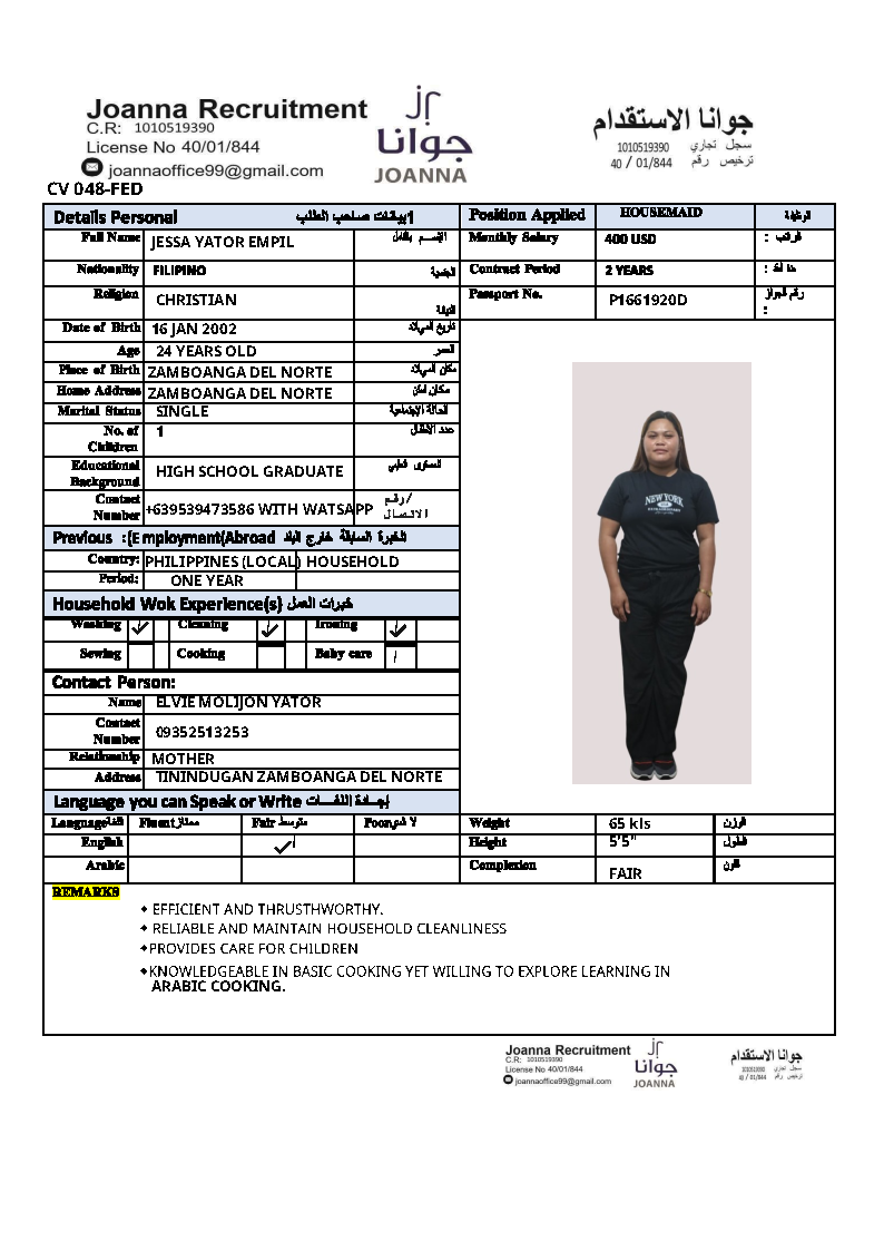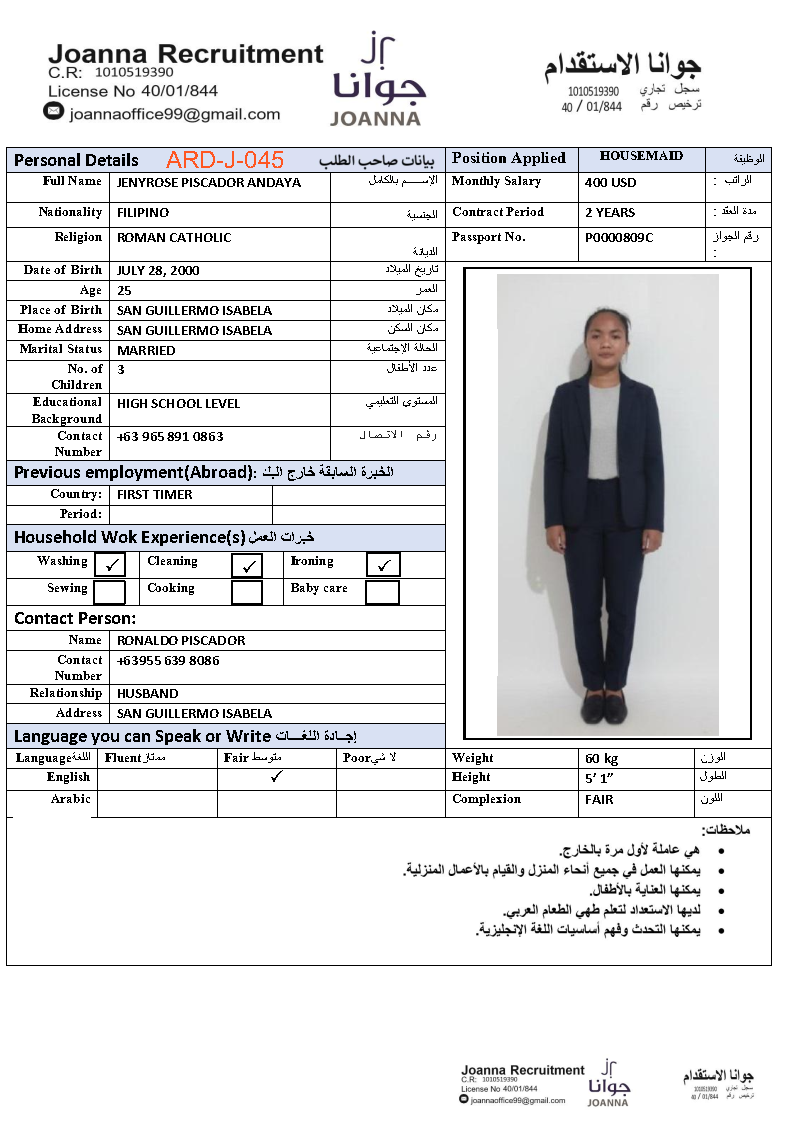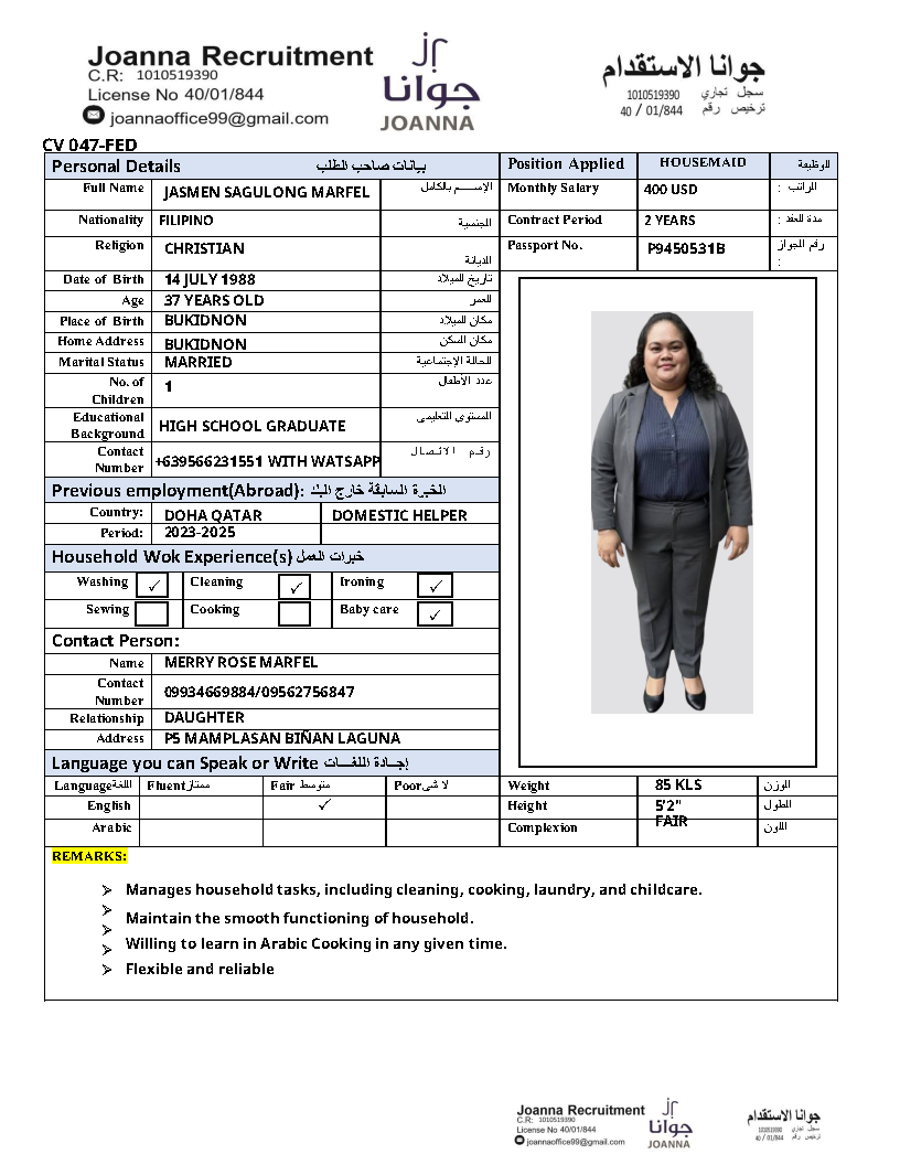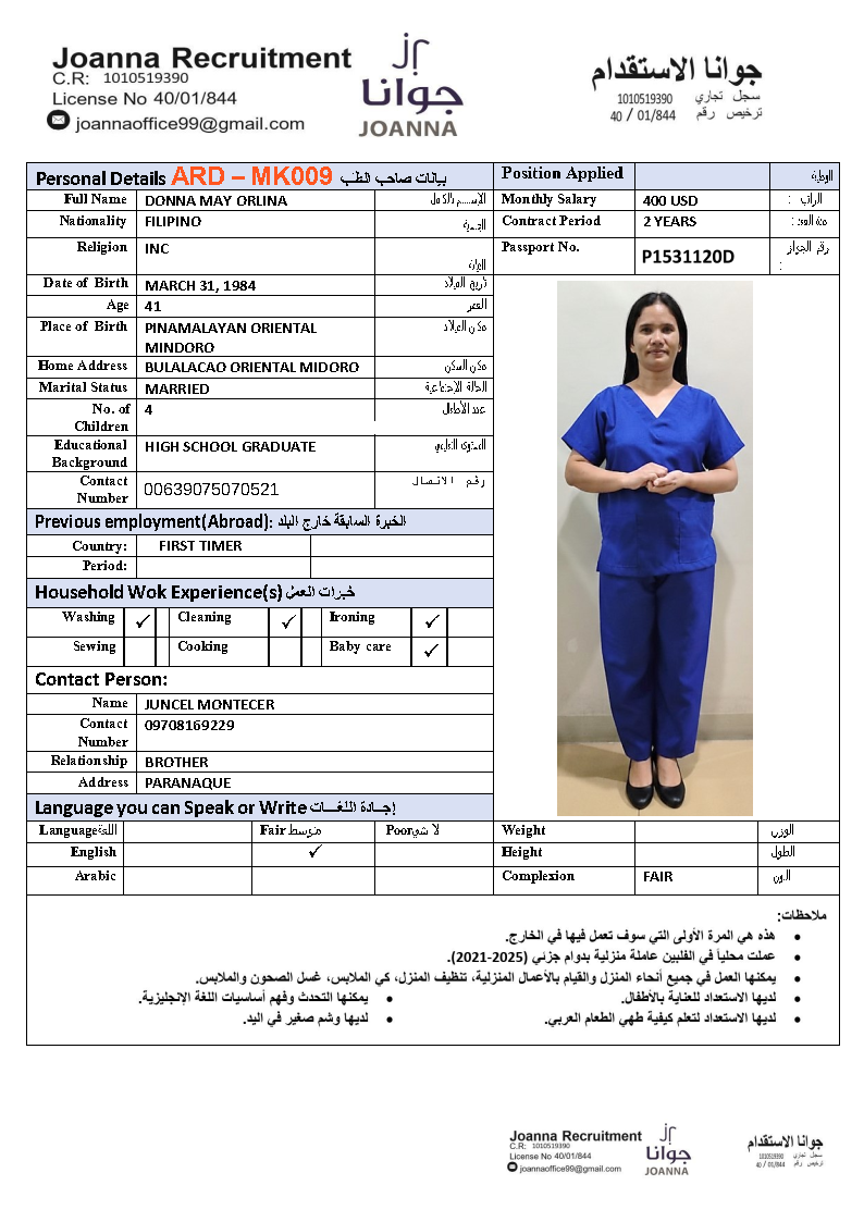 المهارات: عناية اطفال – غسيل – كوي – تنظيف – مساعدة بالطبخ
